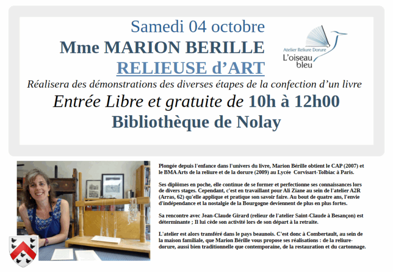 La bibliothèque de Nolay a le plaisir de recevoir, le samedi 4 octobre 2025, la relieuse d’art : Mme Marion Bérille. A cette occasion, elle réalisera diverses démonstrations relatives à la confection d’un livre.